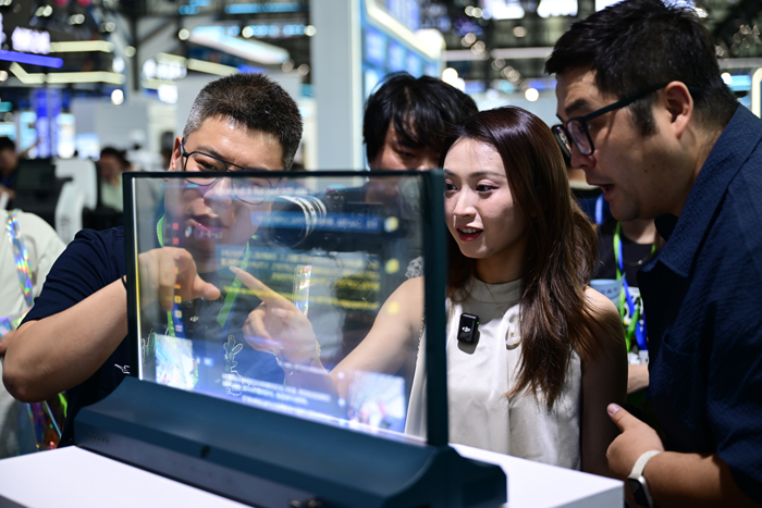 2025年4月26日,观众在第三届中国(安徽)科技创新成果转化交易会上体验一款多语种AI透明屏。新华社记者周牧 摄