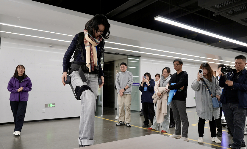 在康养机器人展区,“科技赋能生活”的温度触手可及。一位采访团成员现场穿戴上一款无源双髋助力机器人后,惊喜地表示:“上楼梯都不用我自己用力抬腿,真的很给力!”