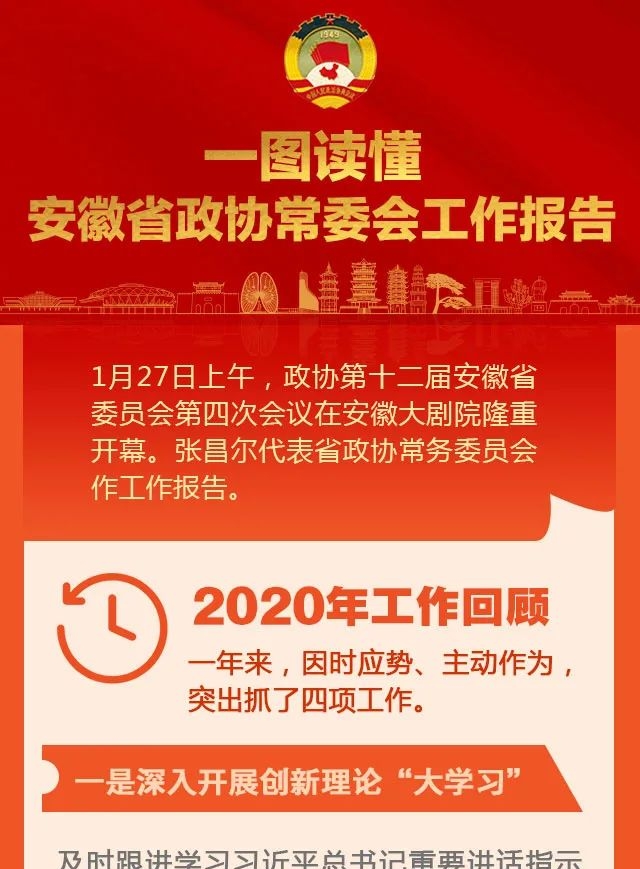 报告指出,今年是实施“十四五”规划、开启全面建设社会主义现代化国家新征程的第一年。要坚持稳中求进工作总基调,立足新发展阶段,贯彻新发展理念,构建新发展格局,扎实做好“六稳”工作、全面落实“六保”任务,努力保持经济运行在合理区间,加快打造具有重要影响力的科技创新策源地、新兴产业聚集地、改革开放新高地和经济社会发展全面绿色转型区,全面开启经济强、百姓富、生态美的新阶段现代化美好安徽建设新征程,确保“十四五”开好局,以优异成绩庆祝建党100周年。