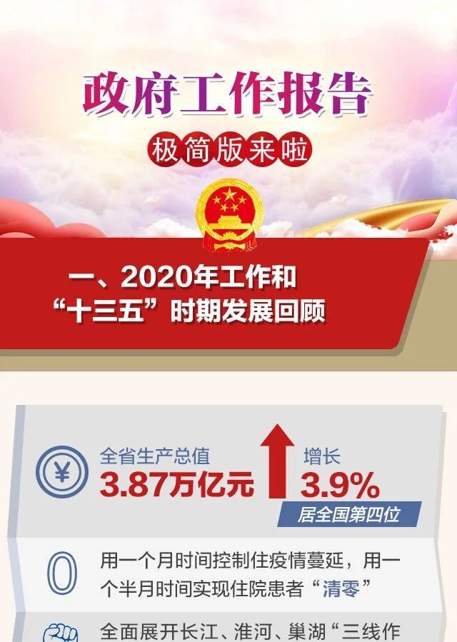 报告指出,2020年,是安徽发展史上极不平凡的一年。我省先后遭遇百年不遇的新冠肺炎疫情和历史罕见的大范围严重汛情。全省人民在以习近平同志为核心的党中央坚强领导下,认真贯彻习近平总书记考察安徽重要讲话指示精神,全面落实党中央、国务院及中共安徽省委决策部署,众志成城,克难奋进,一仗一仗地去打并打胜了疫情防控阻击战、复工复产联动战、精准脱贫收官战、防汛救灾保卫战,实现了经济发展稳定向好、社会大局和谐稳定。经济发展实现量的合理增长和质的稳步提升。