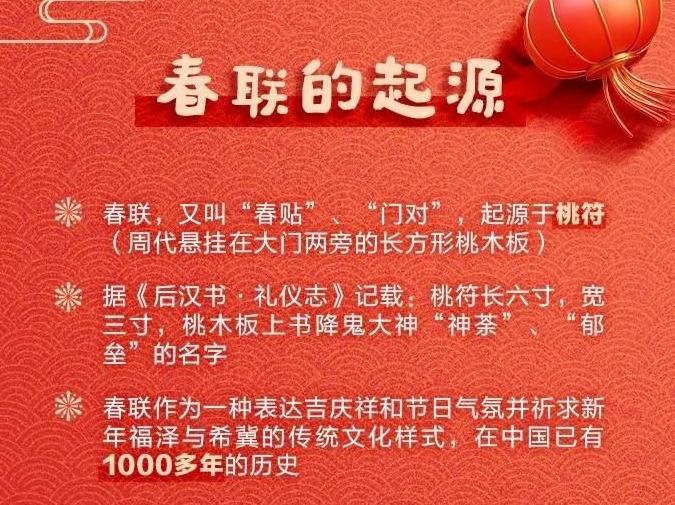 今天是腊月二十八,春节马上就到,你们家乡哪天贴春联?春联作为一种传统文化样式,在中国已有1000多年的历史。怎样区分春联上下联?贴春联有什么讲究?了解春联文化知识,新的一年,愿你福气满满、万事兴“龙”!