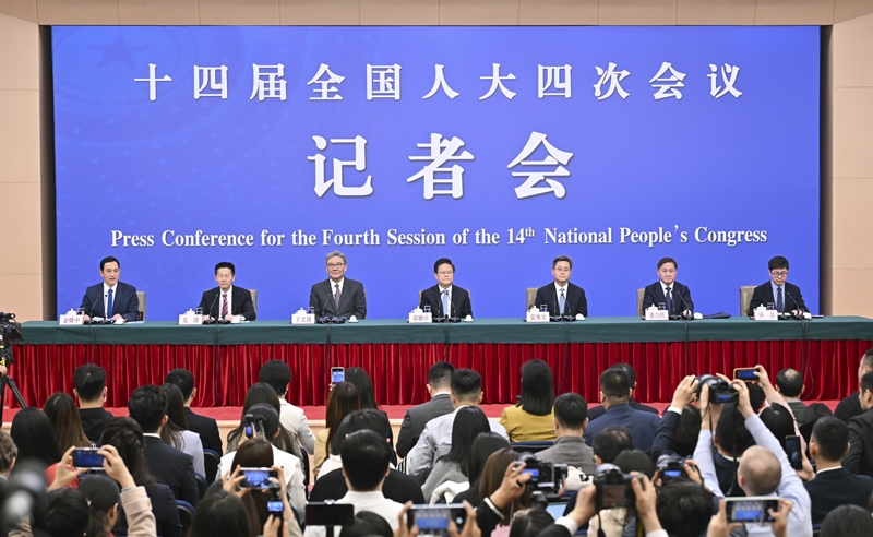 3月6日,十四届全国人大四次会议在北京梅地亚中心新闻发布厅举行记者会。国家发展和改革委员会主任郑栅洁、财政部部长蓝佛安、商务部部长王文涛、中国人民银行行长潘功胜、中国证券监督管理委员会主席吴清就发展改革、财政预算、商务、金融证券等相关问题回答中外记者提问。