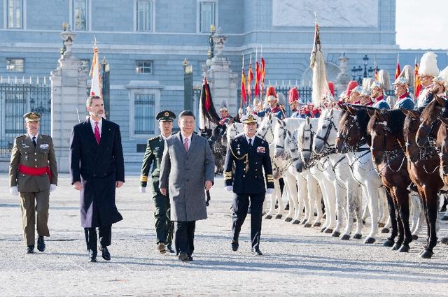 当地时间11月28日,国家主席习近平在马德里出席西班牙国王费利佩六世举行的隆重、盛大的欢迎仪式。这是习近平在费利佩六世国王陪同下检阅骑兵方队。(新华社记者李学仁摄)