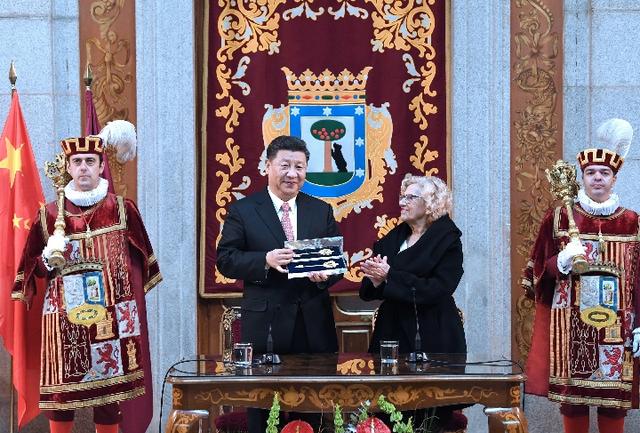 当地时间11月28日,国家主席习近平在马德里市政厅接受马德里城市金钥匙。(新华社记者饶爱民摄)