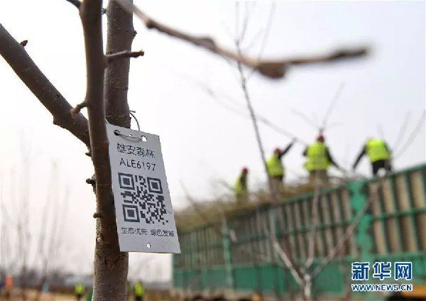 河北雄安新区“千年秀林”栽植苗木上的二维码(3月21日摄)。新华社记者 牟宇摄