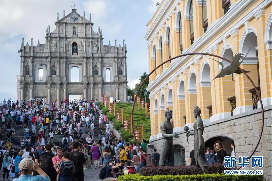 资料图:澳门著名景点大三巴牌坊、议事亭前地游人如织。新华社记者张金加摄