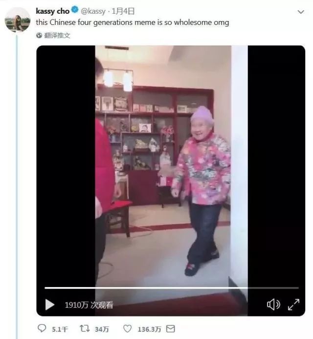 这则视频,以及一系列国内网友的同款“四世同堂”短视频,被国外网站的编辑发现并转发到推特上,迅速火遍全球,不久就有34万人转发,136万人点赞,点击量超过1910万。