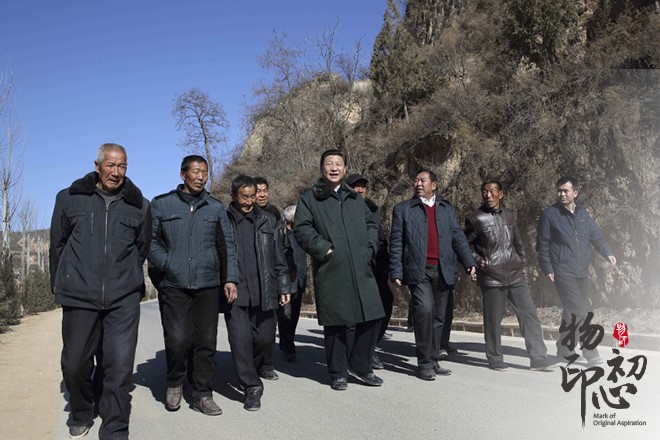 2015年2月13日上午,习近平在延安市延川县文安驿镇梁家河村调研时同村民边走边聊。