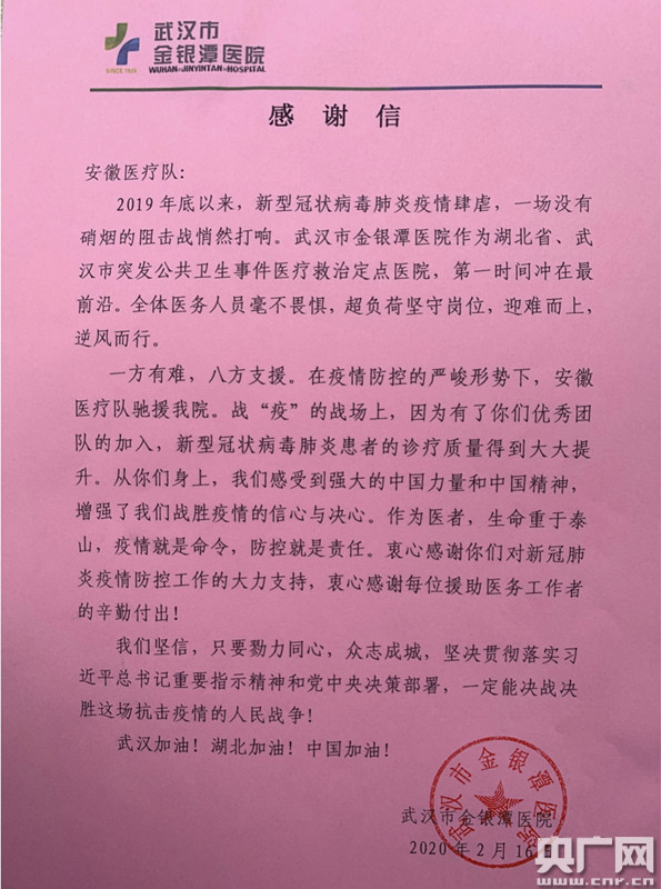(来自武汉金银潭医院的感谢信 央广网发 安医大一附院提供)