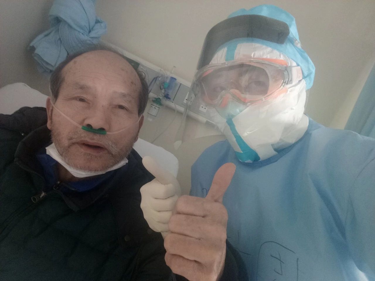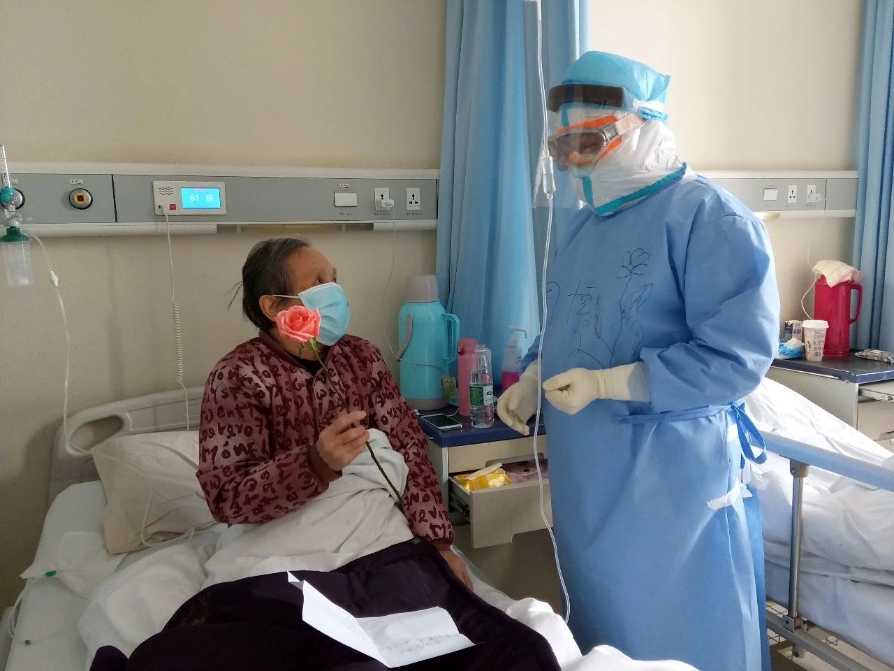 51床和61床是一对老夫妻,70多岁的重症患者,目前病情都逐渐好转,近日将安排出院。就在前天我刚查完房,老爷爷偷偷把我叫到身边对我说:“小周医生,出院前我想给我老伴一个惊喜,可否帮我准备一支玫瑰花,谢谢你们!”