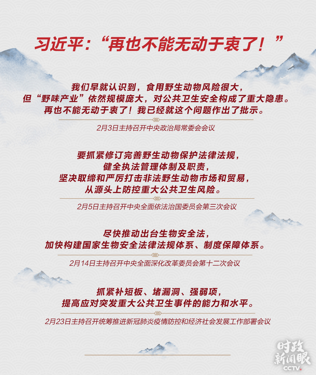 疫情发生以来,习近平不止一次谈到生物安全的问题。2月14日,他在主持召开中央全面深化改革委员会第十二次会议时说,引发这次疫情的病毒,包括此前的非典、高致病性禽流感等疫情的病毒,多数病原体来自野生动物或与之有关,“必须从保护人民健康、保障国家安全、维护国家长治久安的高度,把生物安全纳入国家安全体系。”