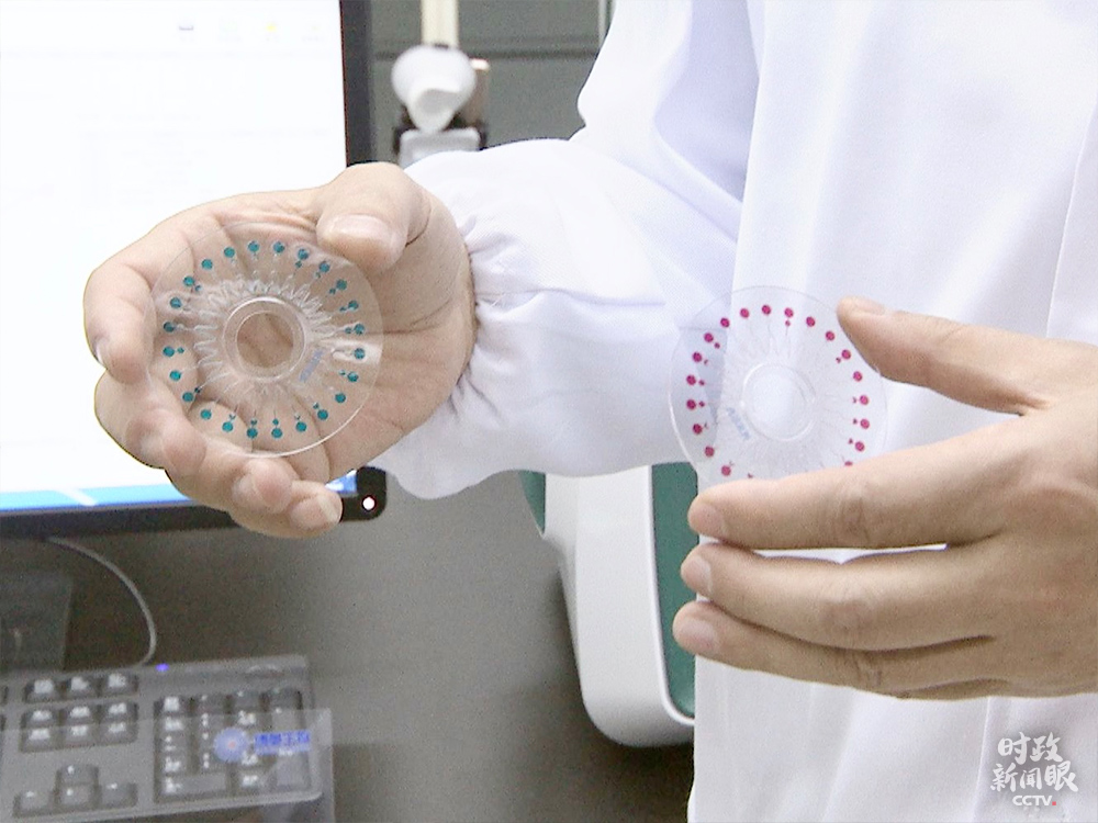 △图中蓝色序号前6种呼吸道病毒,能够被全新微流控芯片系统一次性检测出来。(总台央视记者韩锐拍摄)