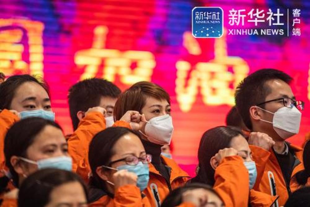 贵州省第九批支援湖北医疗队队员在出发前加油鼓劲,由176人组成的医疗队奔赴鄂州市支援新冠肺炎医疗救治工作(2月22日摄)。新华社记者 陶亮 摄