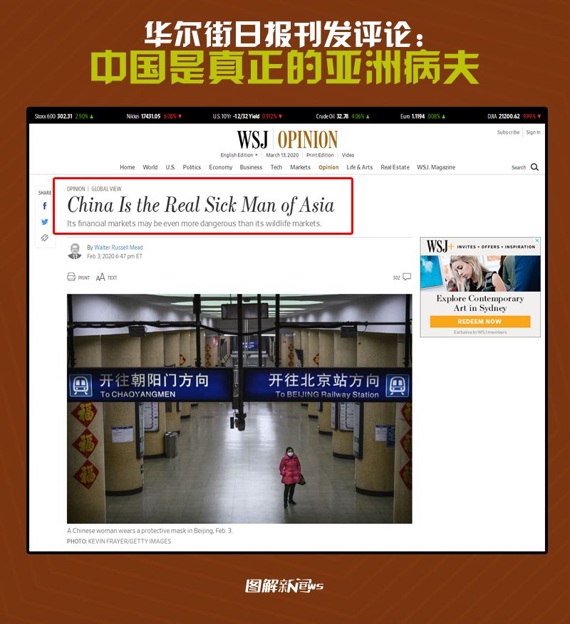 2月3日,美国《华尔街日报》(The Wall Street Journal)刊登了《中国是真正的亚洲病夫》(China Is The Real Sick Man of Asia)一文(见下图)。众所周知,在美国舆论生态里,媒体在报道中都尽力避免出现涉嫌“种族歧视”的报道来彰显政治正确,但是《华尔街日报》毫不避讳地在疫情暴发期间将中国人称为“亚洲病夫”(该文作者称是该报编辑自己修改的标题,对此并不知情)。此文引发海内外华人的抗议,但是在各方要求其道歉之后,该报仍然表示立场不变,拒绝采取一切补救措施。