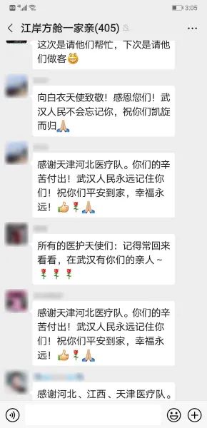 由于很多舱友仍在隔离点接受隔离,不方便去送行,大家便在群里“列队”送别与感谢。“虽然我爱的人走了,但同他一样在生死线上濒死挣扎的众多武汉人,因为你们的到来才从死神的手中逃了出来!谢谢你们,为湖北拼过命!”一位舱友在群里留言说道。除了感恩和祝愿,热情的武汉人民不忘盛邀医疗队员们他日再来:记得常回来看看,到时候一定热情款待!