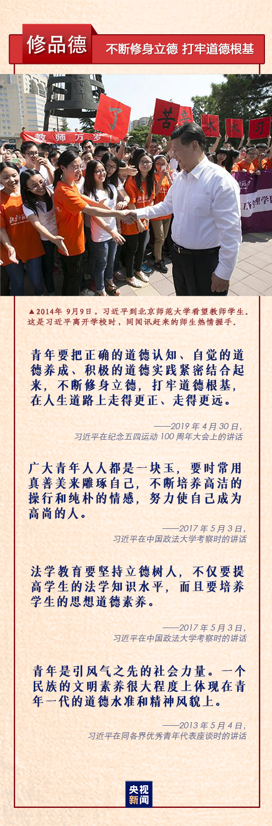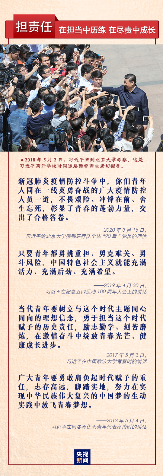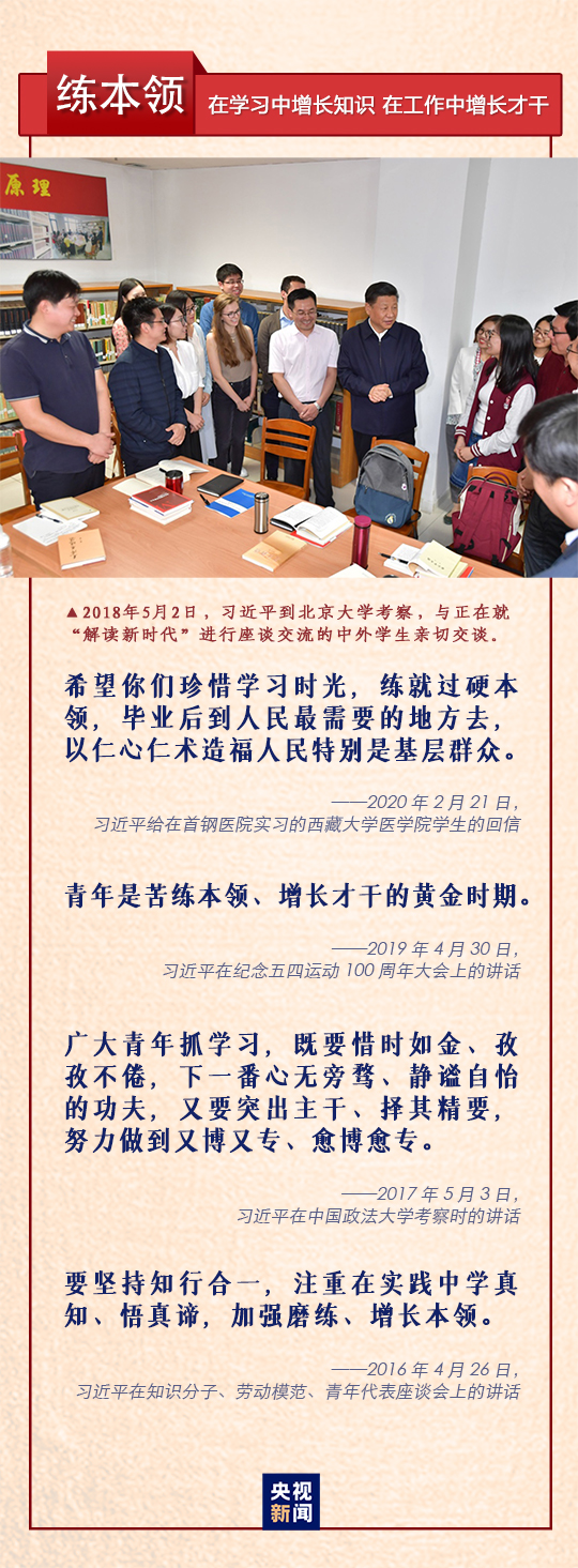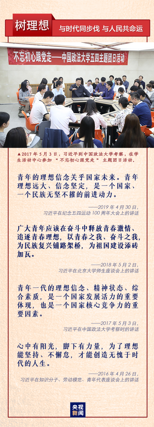 “树立远大理想”“热爱伟大祖国”“担当时代责任”“勇于砥砺奋斗”“练就过硬本领”“锤炼品德修为”,习近平总书记在纪念五四运动100周年大会上对新时代中国青年提出六点希望,激励广大青年不惧风雨、不畏险阻,在实现中华民族伟大复兴中国梦的进程中不断开拓创新、奋发有为。