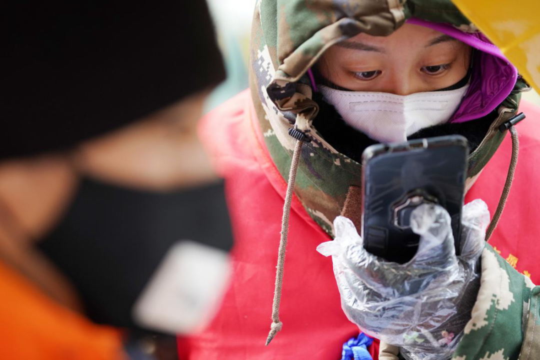 1993年出生的李文琦,是在深圳工作的哈尔滨人,春节返乡回哈后成为社区志愿者。她说:“国家有难,我们‘90后’正值青年,身强力壮,应该往前冲。”图为李文琦(右)在检查往来车辆人员的手续证明。新华社记者 王建威/摄