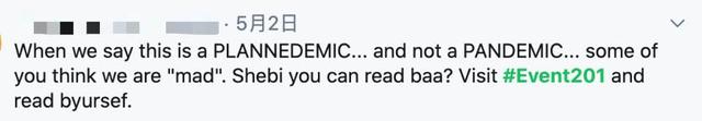 “当我们说这是一个计划,而不是大流行时,有些人会认为我们‘疯了’。你们可以去仔细看看#事件201。”↓↓↓