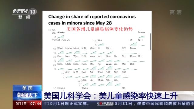《纽约时报》8月31日的报道援引了美国儿科学会的统计数据。这份数据的统计区间为今年5月21日至8月20日。在新增确诊病例、入院治疗病例和死亡病例的增长速度上,美国儿童远超美国民众的平均水平。美国儿科学会专家肖恩·奥利里表示,美国多地的社区传播事件均与儿童感染病例有关。