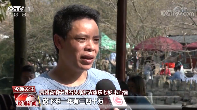 韦启编,贵州黄果树镇石头寨村村民。自从公路修到了家门口,自己当农家乐老板的梦终于实现了。如今在贵州,只要是超过三十户的村民组,硬化路都会修到家门口。当地打通了乡村旅游和产业发展之路,通过“民族村寨+特色餐饮+家庭旅馆”“合作社+体验旅游+贫困农户”等模式,用旅游业覆盖贫困户。