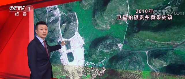 我们再看看贵州安顺市的黄果树镇。10年前,这里还只有一横一竖两条白色的县乡公路。10年后,公路变得密密麻麻。出山有了更多选择。这条是沪昆高速,由西南到东北跨省而过。卫星能看到的可不光是路。