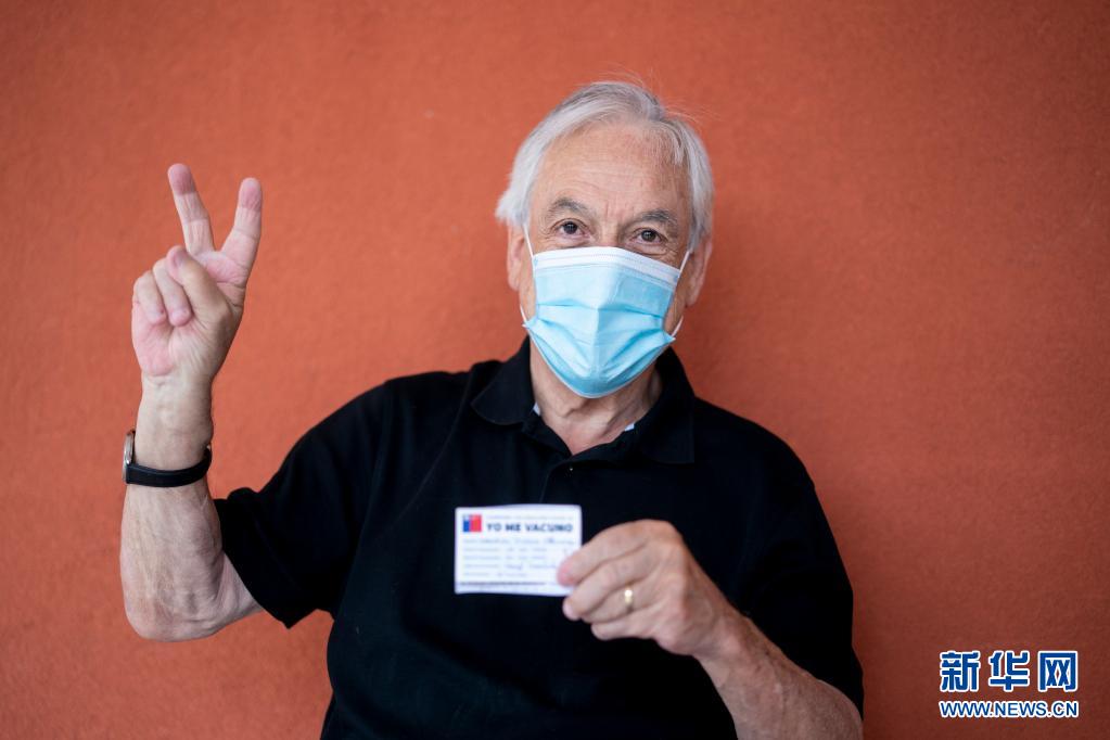 2月12日,在智利南部河大区福德罗诺市的一处社区家庭保健中心,智利总统皮涅拉接种中国疫苗后比出“V”的手势。新华社发