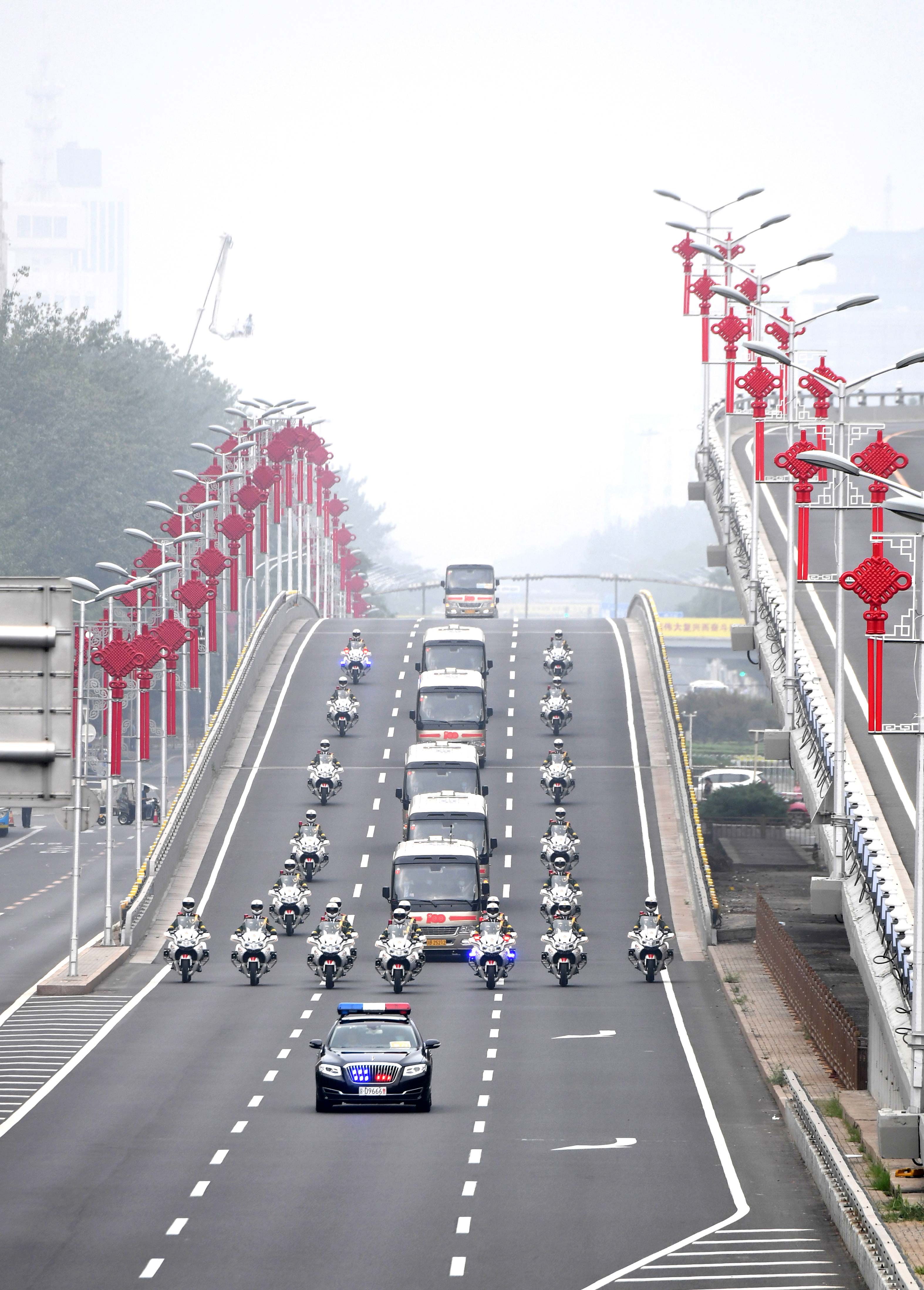 △2021年6月29日,“七一勋章”获得者集体乘坐礼宾车从住地出发,由国宾护卫队护卫前往人民大会堂。