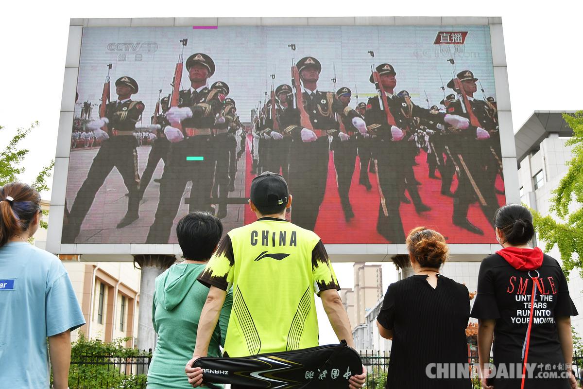 7月1日,市民在山东省烟台市福山区一广场观看庆祝中国共产党成立100周年大会电视直播。(孙文潭 摄)