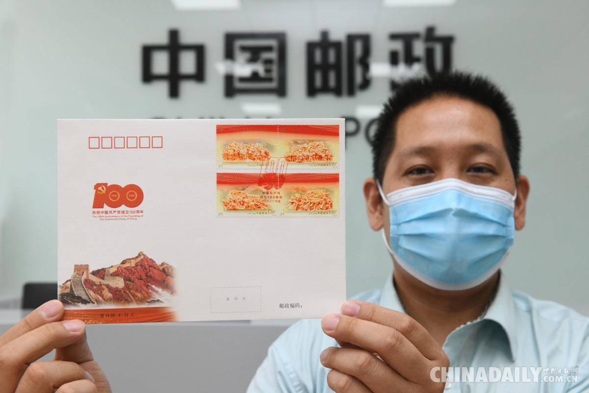 7月1日,在中国邮政集团河北省新乐市分公司,工作人员展示当日发行的《中国共产党成立100周年》纪念邮票首日封。(贾敏杰 摄)