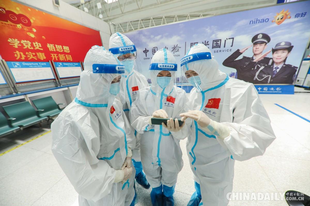 7月1日,肩负疫情防控职责的山东出入境边防检查总站青岛机场出入境边防检查站民警勤务间隙通过手机收看中国共产党成立100周年庆祝大会。(解豪 摄)