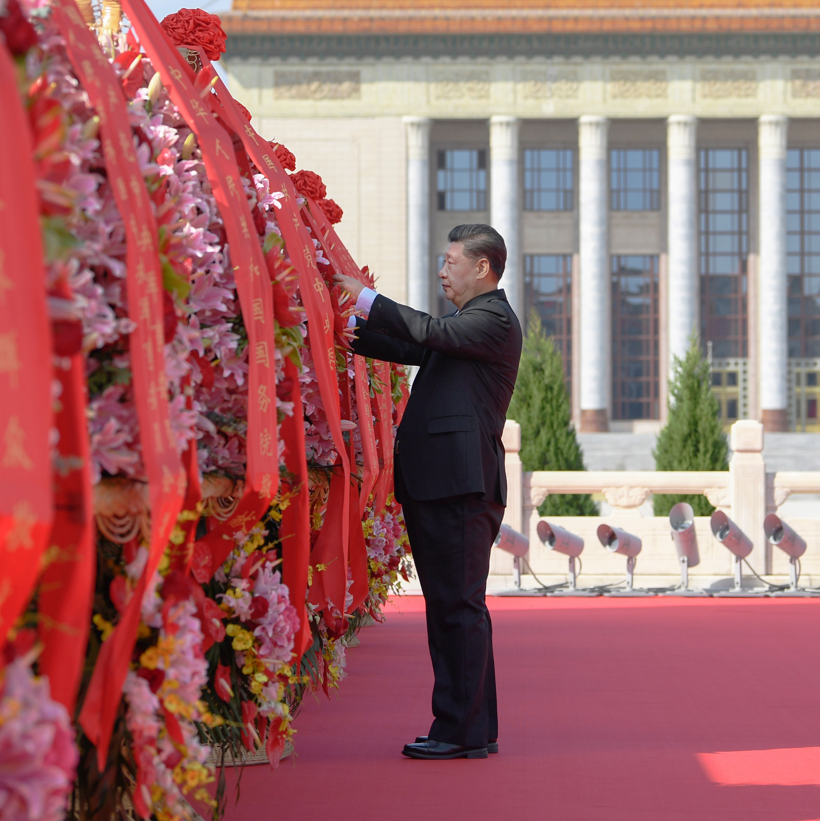 △2020年9月30日上午,习近平总书记出席烈士纪念日向人民英雄敬献花篮仪式。这是习近平总书记整理花篮上的缎带。