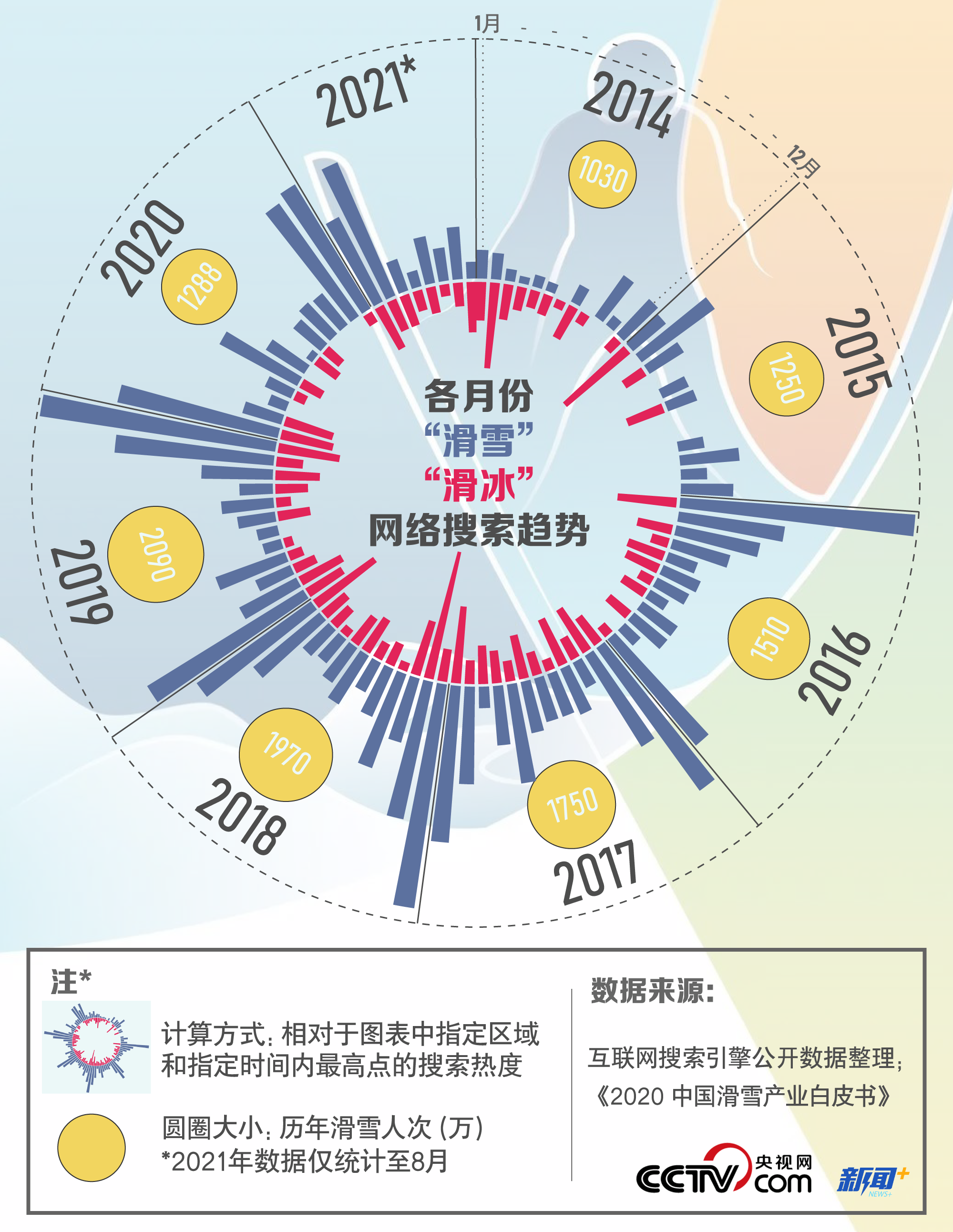 据央视网统计,自2016年起,公众在互联网搜索“滑雪”“滑冰”等冰雪项目的频次明显上升,且多集中在11月、12月和次年1月。除2020年受疫情防控的影响外,实际参与滑雪项目的群众也逐年增多,2019年参与滑雪运动的人次是2014年的二倍。