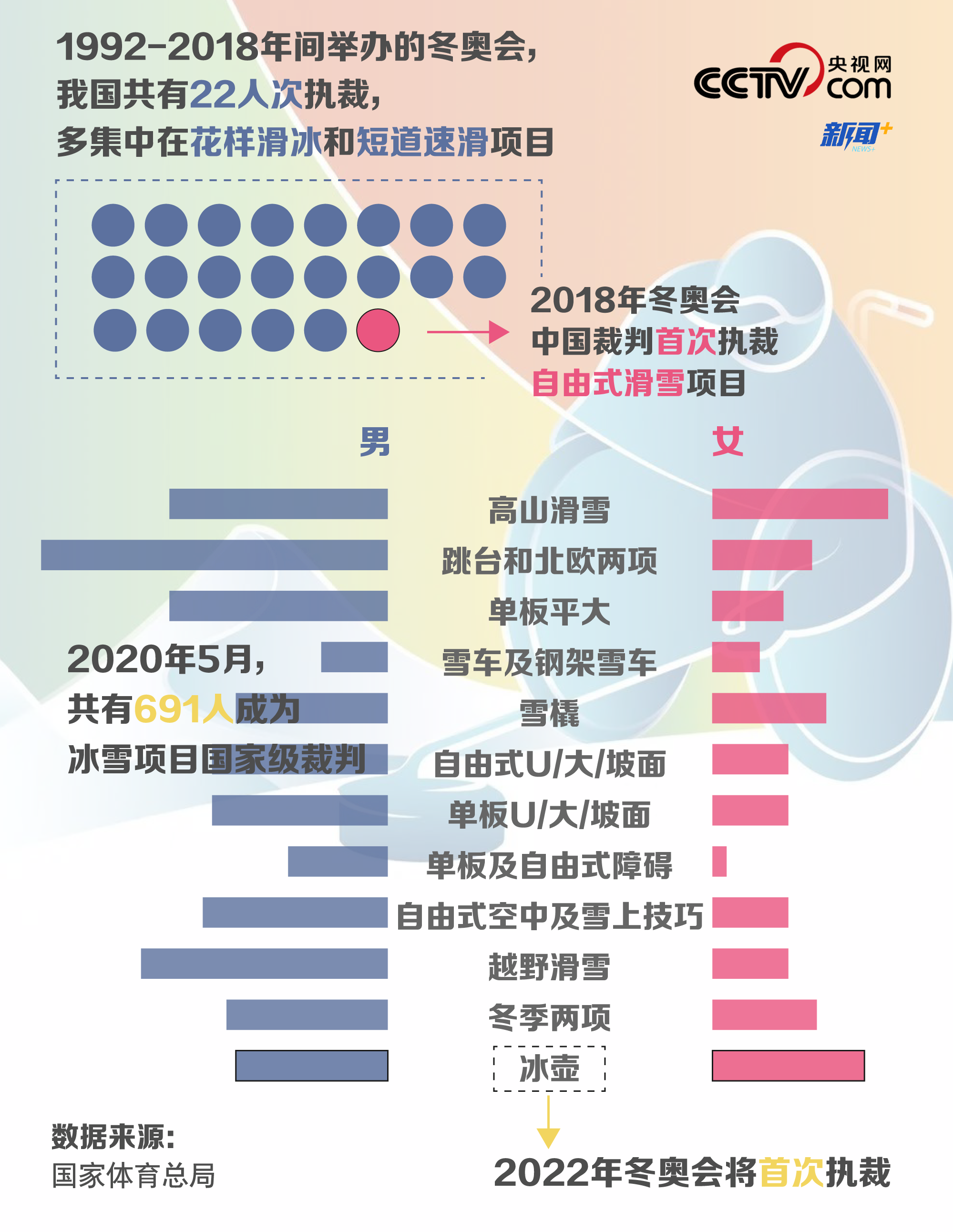 除了选手们在赛场上大放异彩,冬奥会赛场上的裁判席也开始出现“中国身影”。据统计,1992-2018年的冬奥会中,我国共有22人次担任裁判,2018年的冬奥赛场上出现首位自由式滑雪空中技巧项目的中国裁判。为更好地做好冰雪项目竞赛工作,体育总局冬运中心于2020年5月授予691人冰雪项目国家级裁判员称号,其中多为雪上项目裁判员。值得一提的是,2022年冬奥会将有4名中国冰壶裁判首次执裁。