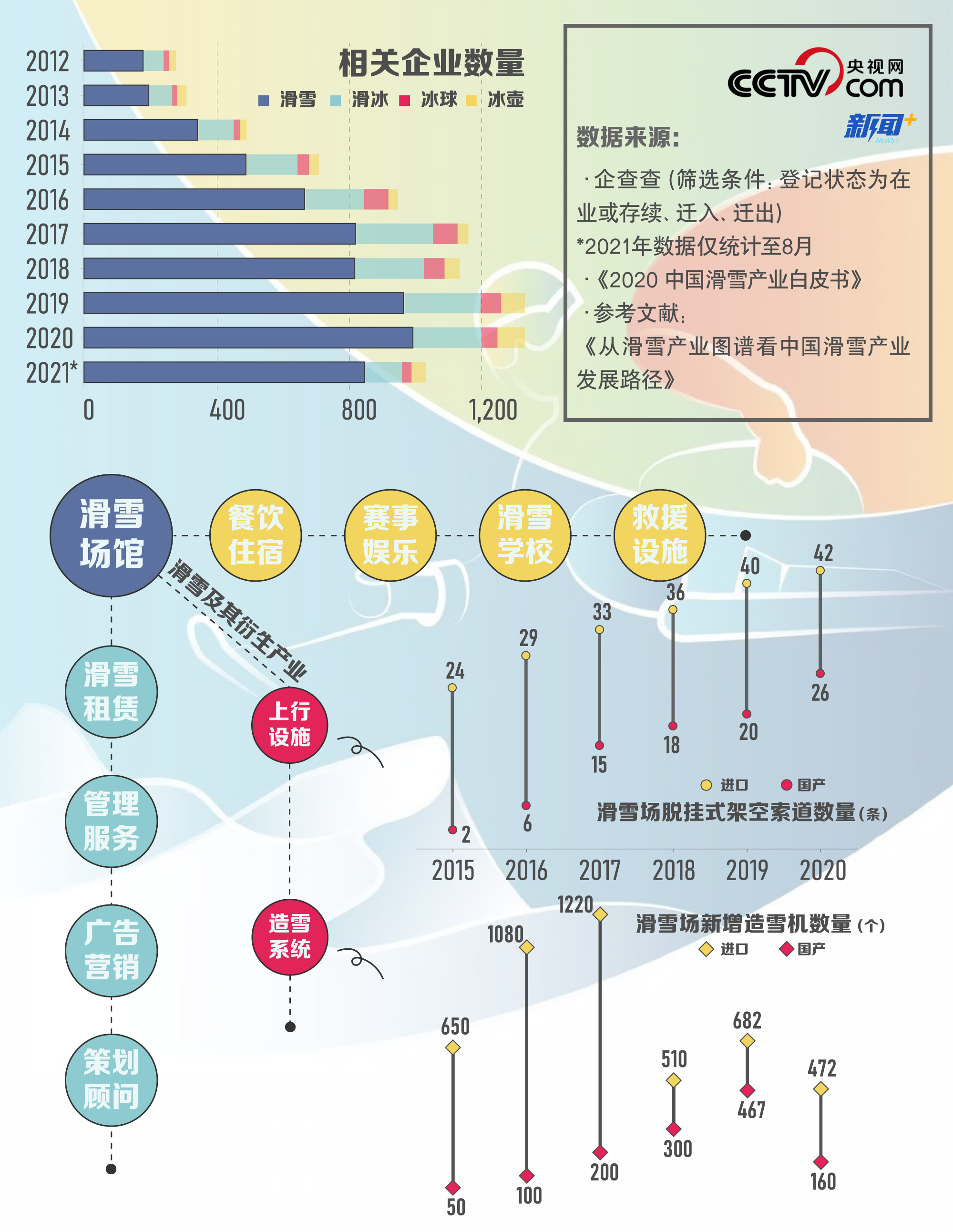 大众对于冰雪运动的衍生需求给冰雪产业的发展奠定了一定基础。近几年,中国冰雪产业蓬勃发展,相关企业数量呈明显上升趋势,2020年仅“滑雪”类企业数量就超过2016年四类冰雪企业数量总和。同时,我国冰雪产业规模扩大、覆盖范围也变广,国产品牌逐渐“崭露头角”。比如国产脱挂式架空索道的发展势头迅猛,从2015年仅有个位数增长到2020年的26条,此外国产造雪机也正代替进口商品被雪场经营方使用。由此可见,人们对于冰雪的喜爱不仅表现在“直接参与”,还间接推动了衍生产业的发展。