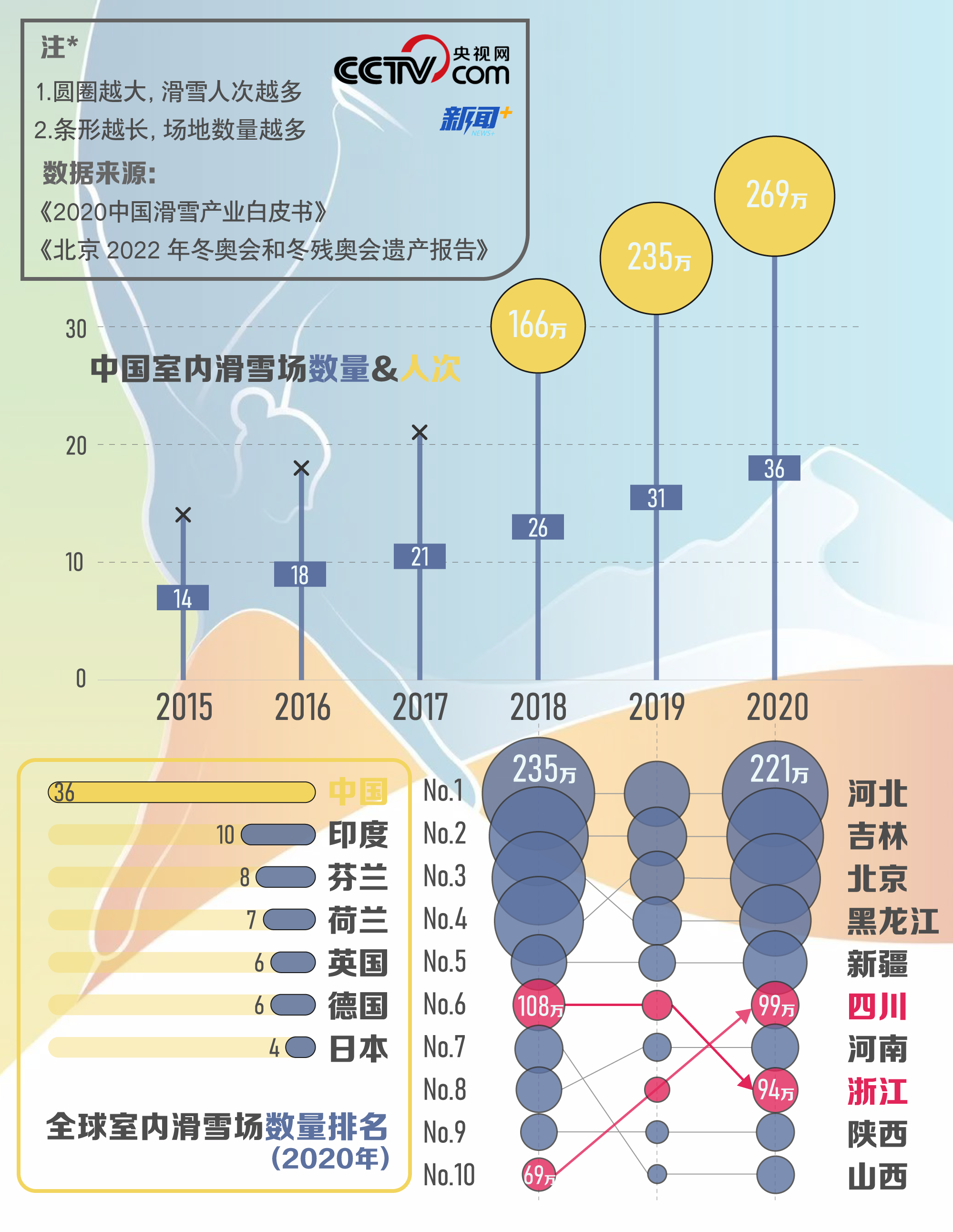 尽管与国际上众多滑雪产业发达国家相比,中国户外雪场的整体规模还存在不小的差距,但从室内滑雪场的发展来看,截至2020年年底,国内开业的室内滑雪场馆已达36家,遥遥领先,位居榜首。