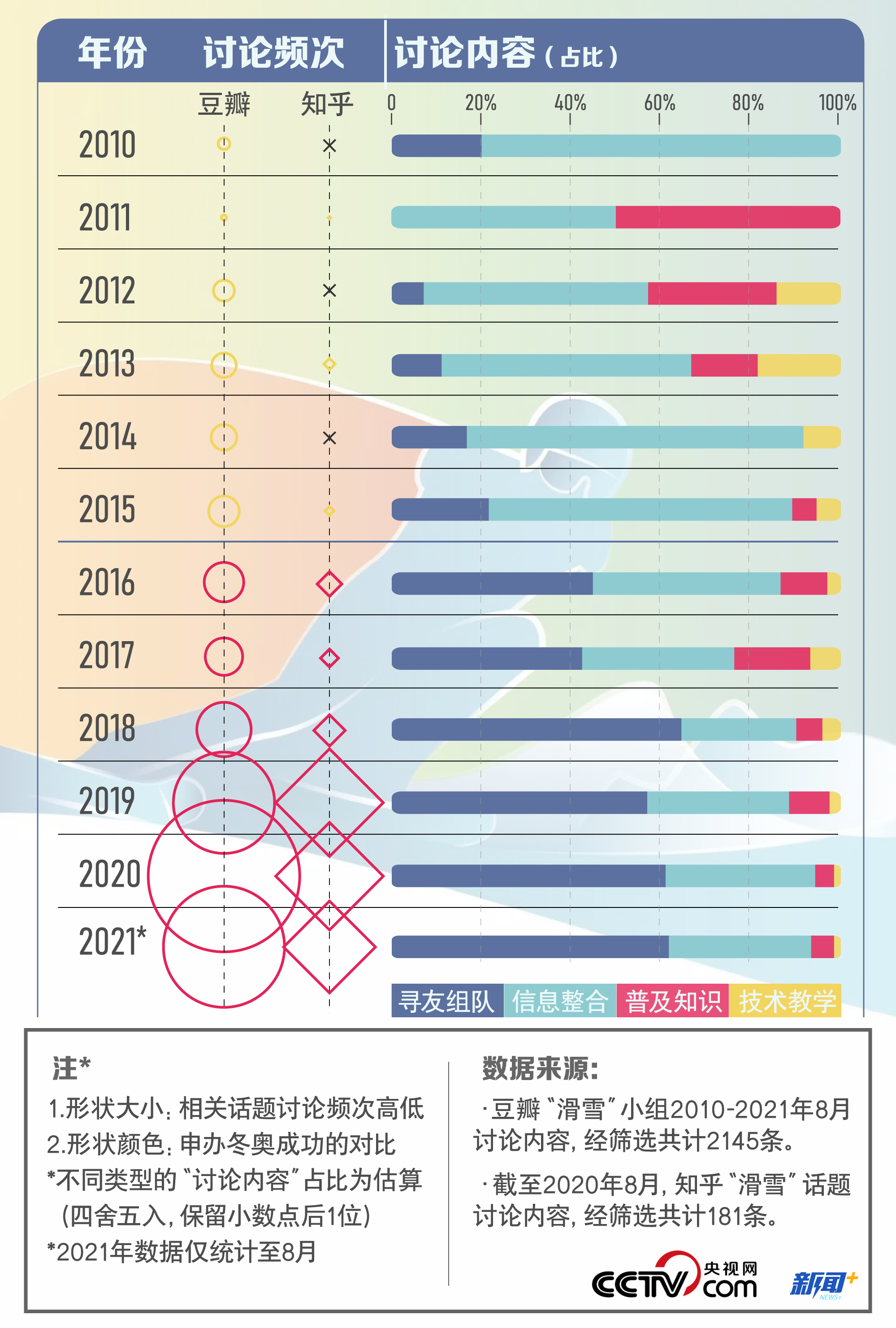此外,人们对冰雪运动关注和讨论的内容也悄然改变。统计发现,随着中国互联网的发展,2016年开始,“滑雪”在网络平台的讨论频次较前五年相比明显增加,“寻友组队”成为大部分爱好者的第一需求,而且讨论的内容也更为丰富多元,侧面反映了滑雪项目正逐渐脱离“小众”,走向“大众”。