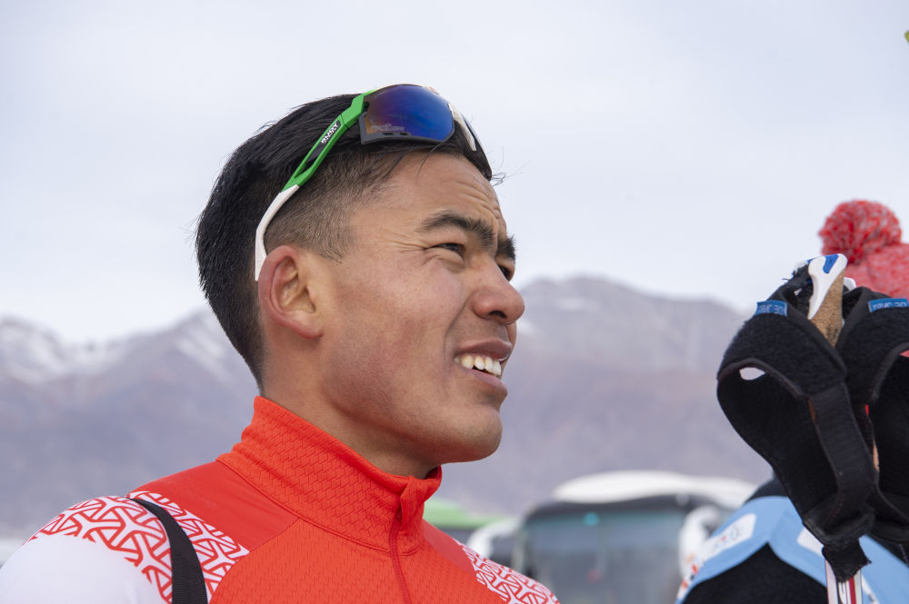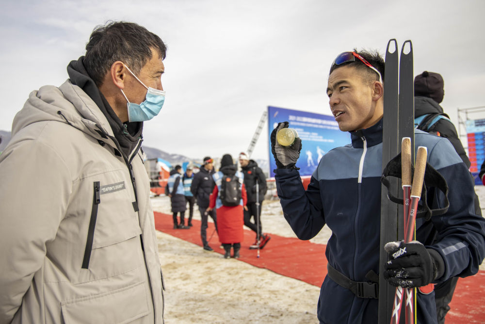 ↑这是一次训练结束后,在温泉县越野滑雪,吐尔松江·布尔力克(右)和体育启蒙老师阿布都沙拉木·赛买提交流(2021年11月22日摄)。这次回乡训练比赛,吐尔松江吸引了家乡父老的目光。