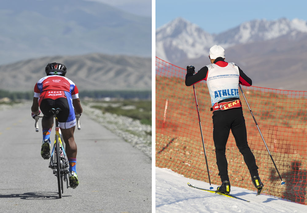 ↑拼版照片:上图为第十一届环赛里木湖公路自行车赛前,吐尔松江·布尔力克在温泉县的一处乡村公路上练习(2017年5月29日摄);下图为吐尔松江·布尔力克 随越野滑雪国家集训队在新疆温泉县越野滑雪场训练(2021年11月25日摄)。