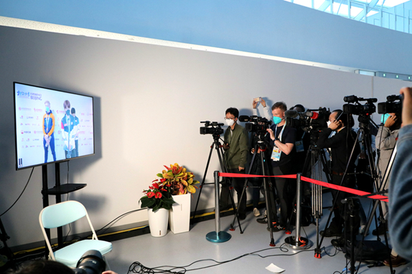 根据疫情防控要求,本次系列测试赛和测试活动的赛后采访均采用“远程采访”方式,记者们通过大屏幕与运动员进行视频连线。