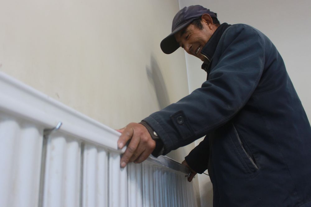 2020年12月1日,青海省西宁市湟源县申中乡前沟村村民王录在感受新装暖气片的温度。新华社记者 解统强 摄