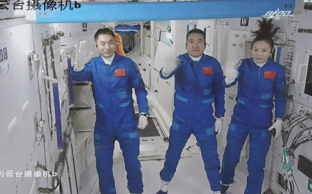 2021年10月16日在北京航天飞行控制中心拍摄的进驻天和核心舱的航天员翟志刚(中)、王亚平(右)、叶光富向全国人民挥手致意的画面。新华社记者 田定宇 摄