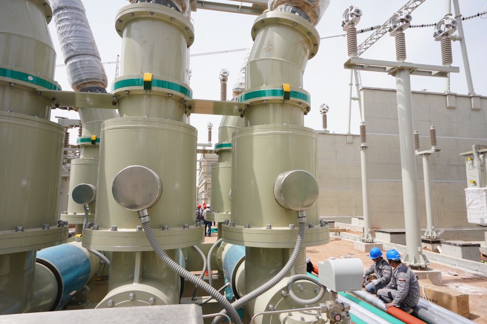 2019年5月8日,工人在位于河北省张家口市康保县姚家滩村的张北可再生能源柔性直流电网康保换流站施工。新华社记者杨世尧摄