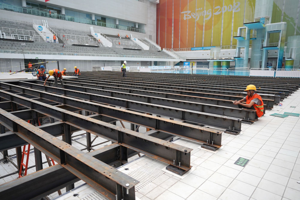 2019年7月10日,施工人员在“水立方”进行冰场可转换结构施工。新华社记者鞠焕宗摄