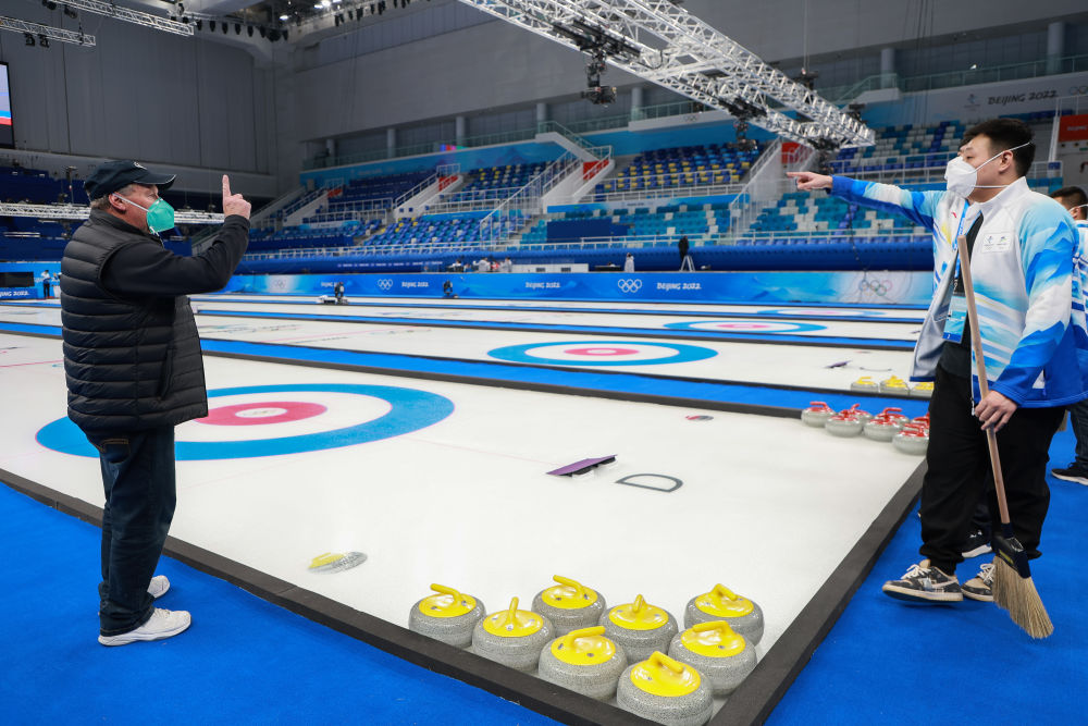 来自加拿大的制冰师汉斯·乌斯里奇(左)在冰壶赛道旁与中方人员交流。新华社记者刘续摄