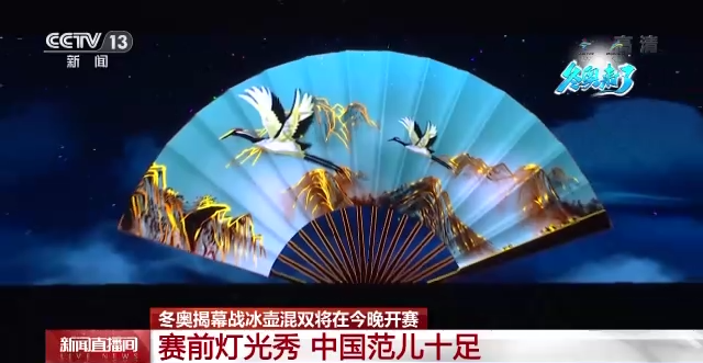 作为东道主,每场冰壶比赛开始前,冰立方都会播放颇具中国韵味儿的灯光秀。赛场大屏幕和冰面上会出现折扇、莲花和明月等元素,惊喜之余,让人叹为观止。