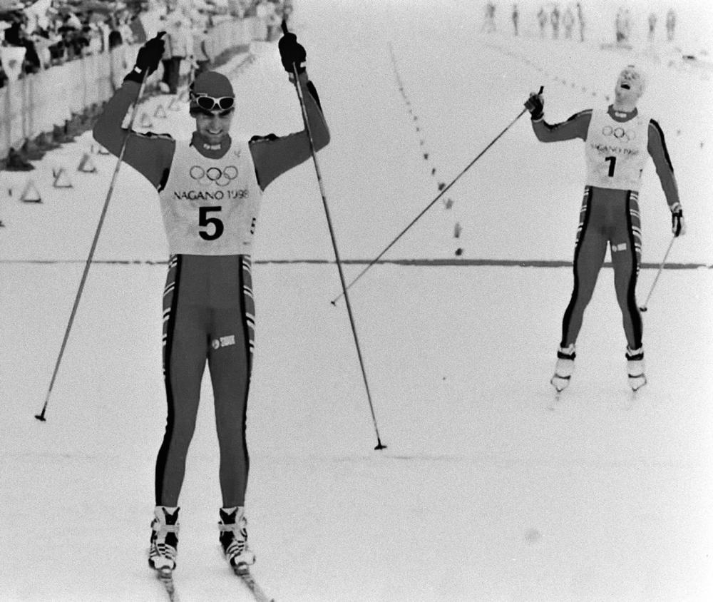 1998年2月14日,在日本长野白马村神城越野滑雪场进行的冬奥会越野滑雪男子自由追逐赛中,挪威选手托马斯·阿尔斯戈尔(左)和比约恩·代赫利耶分获冠、亚军。新华社发(共同社照片)