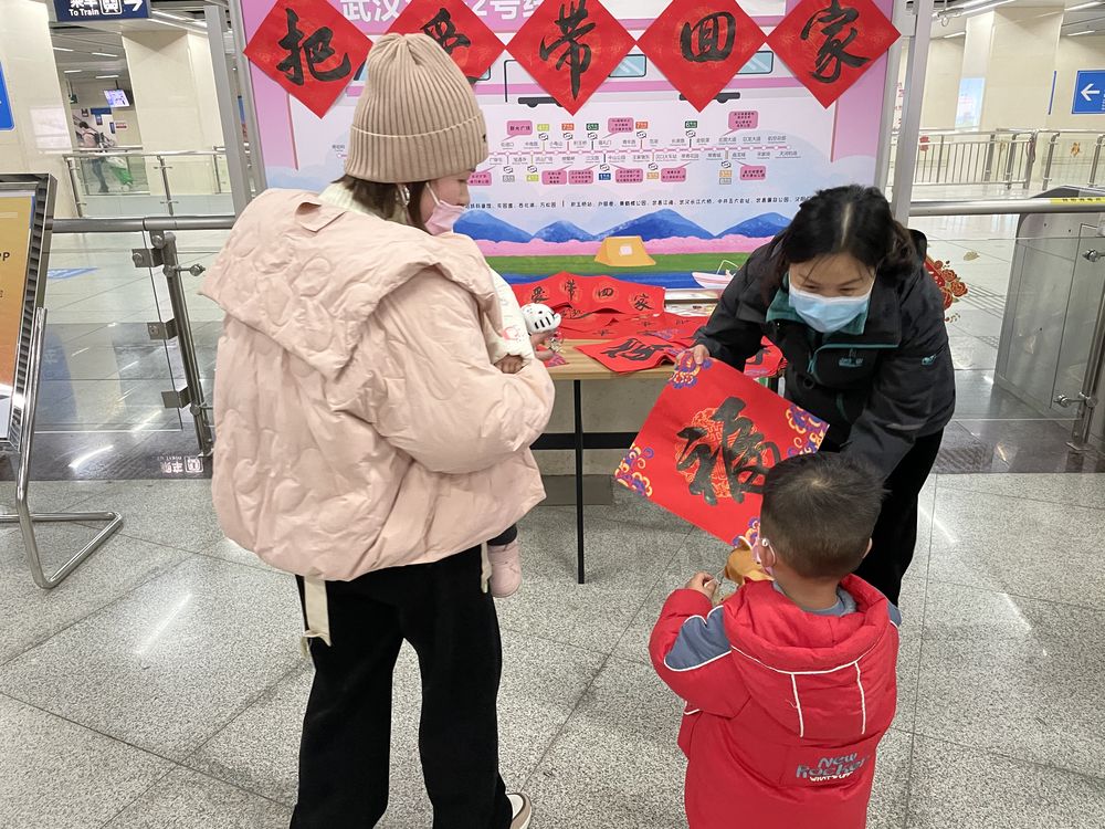 春运期间的汉口火车站,人们拎着大包小包,行色匆匆。为方便到达武汉的火车旅客换乘地铁,姚婕所工作的这座地铁站实行“免检模式”,人们下火车后,可经过“免安检通道”,直达地铁站。今年春运期间,地铁站入口的柱子上,张贴着红色的“会合点”指引标识,这是姚婕为方便人们接亲友而想到的点子。