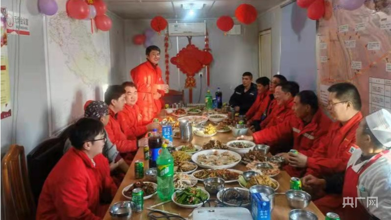 除夕夜,尖北采气站欢度春节,小站全员其乐融融吃着年夜饭,年味四溢欢乐多(央广网发 姚葭摄)