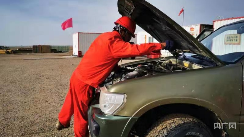 为了能够保障春节期间车辆安全运行,尖北采气站班员许文鹏在仔细检查“爱车”(央广网发 姚葭摄)