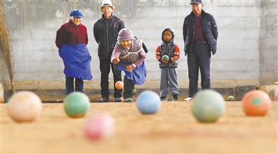 2月5日,云南省丽江市玉龙县拉市镇丰乐村,87岁的纳西族老人木润生(中)在体验地掷球运动。